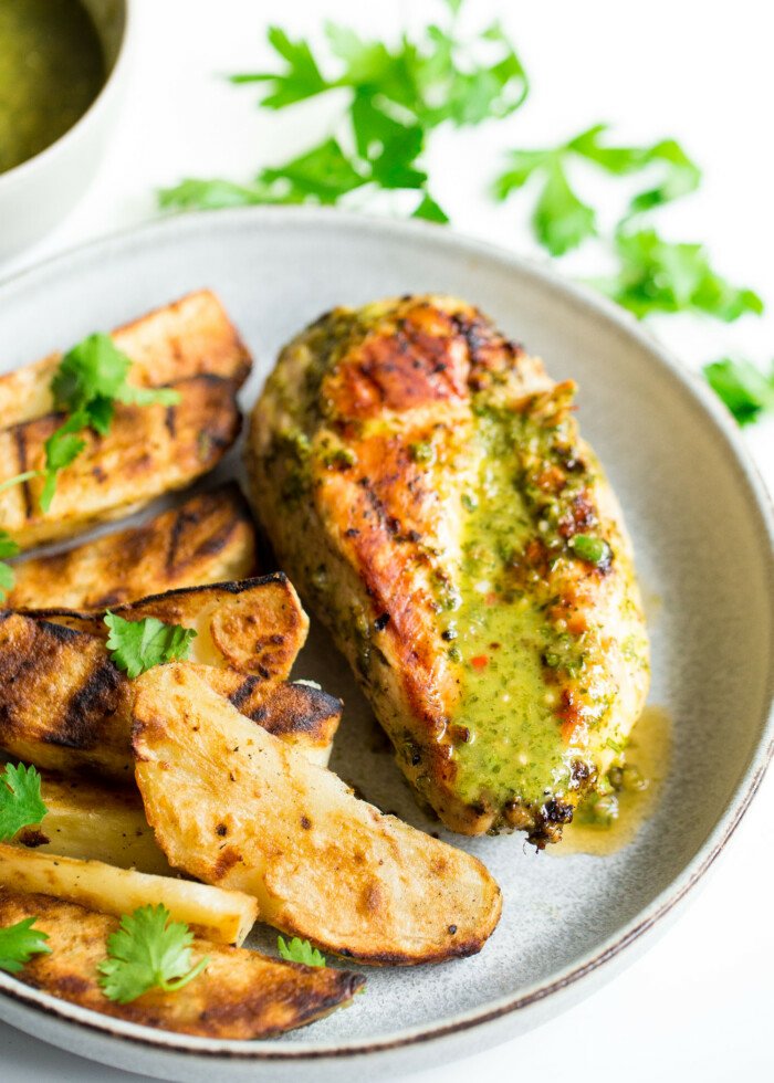 - To prepare the dinner, start by making the chimichurri a bit in advance to marinate the chicken. In a food processor, blend the herbs, garlic, onion, vinegar, and oil until smooth.